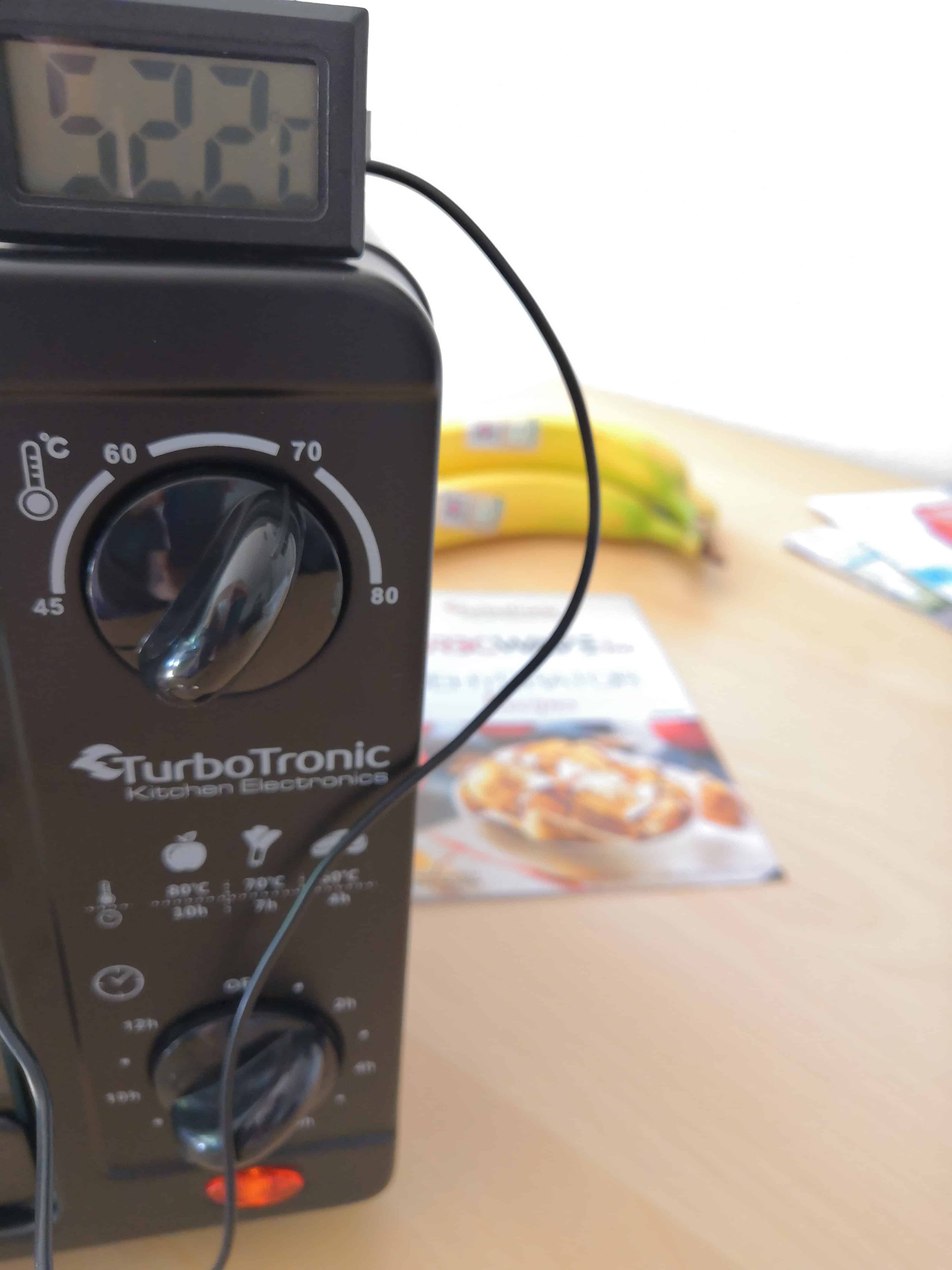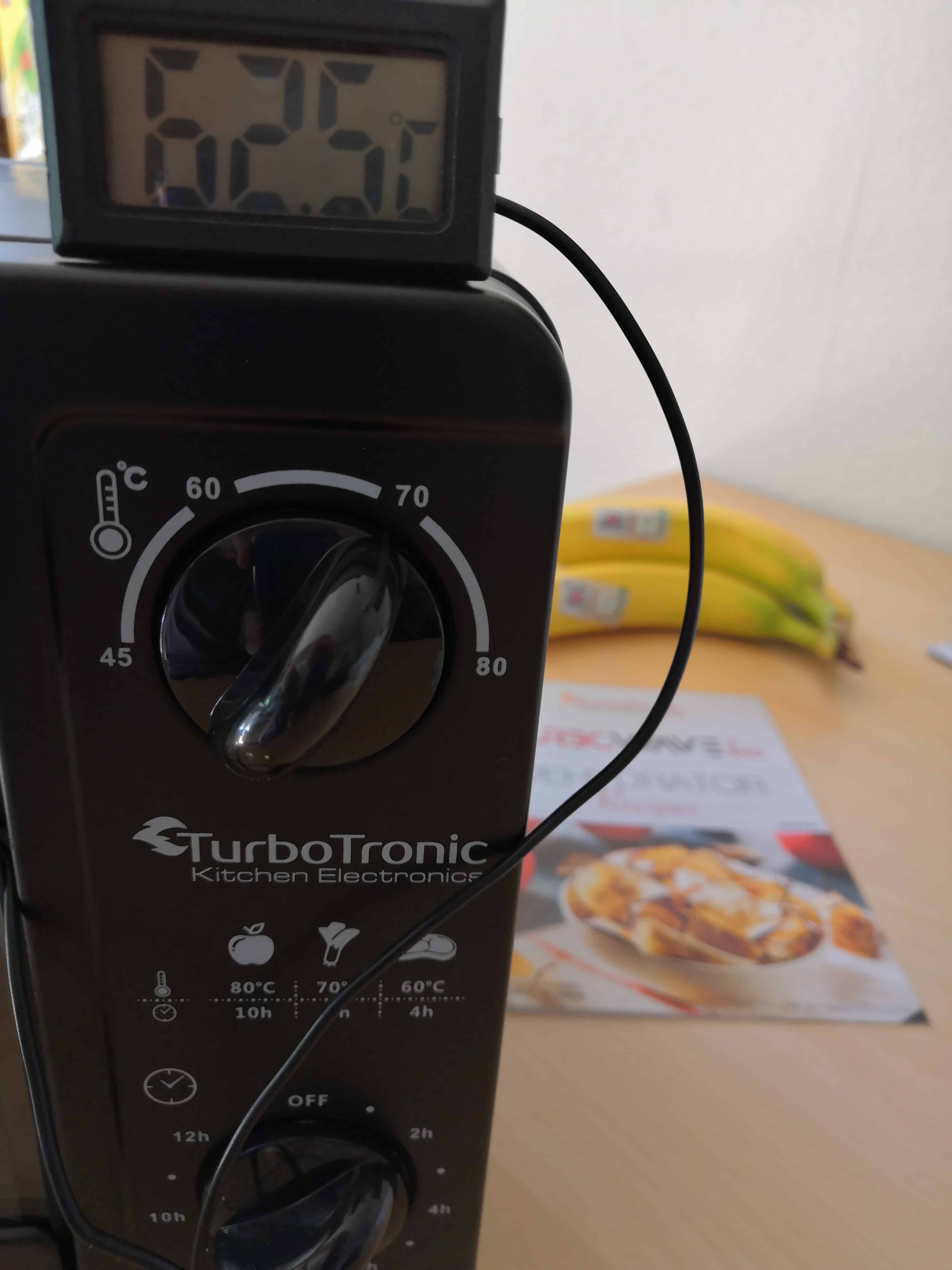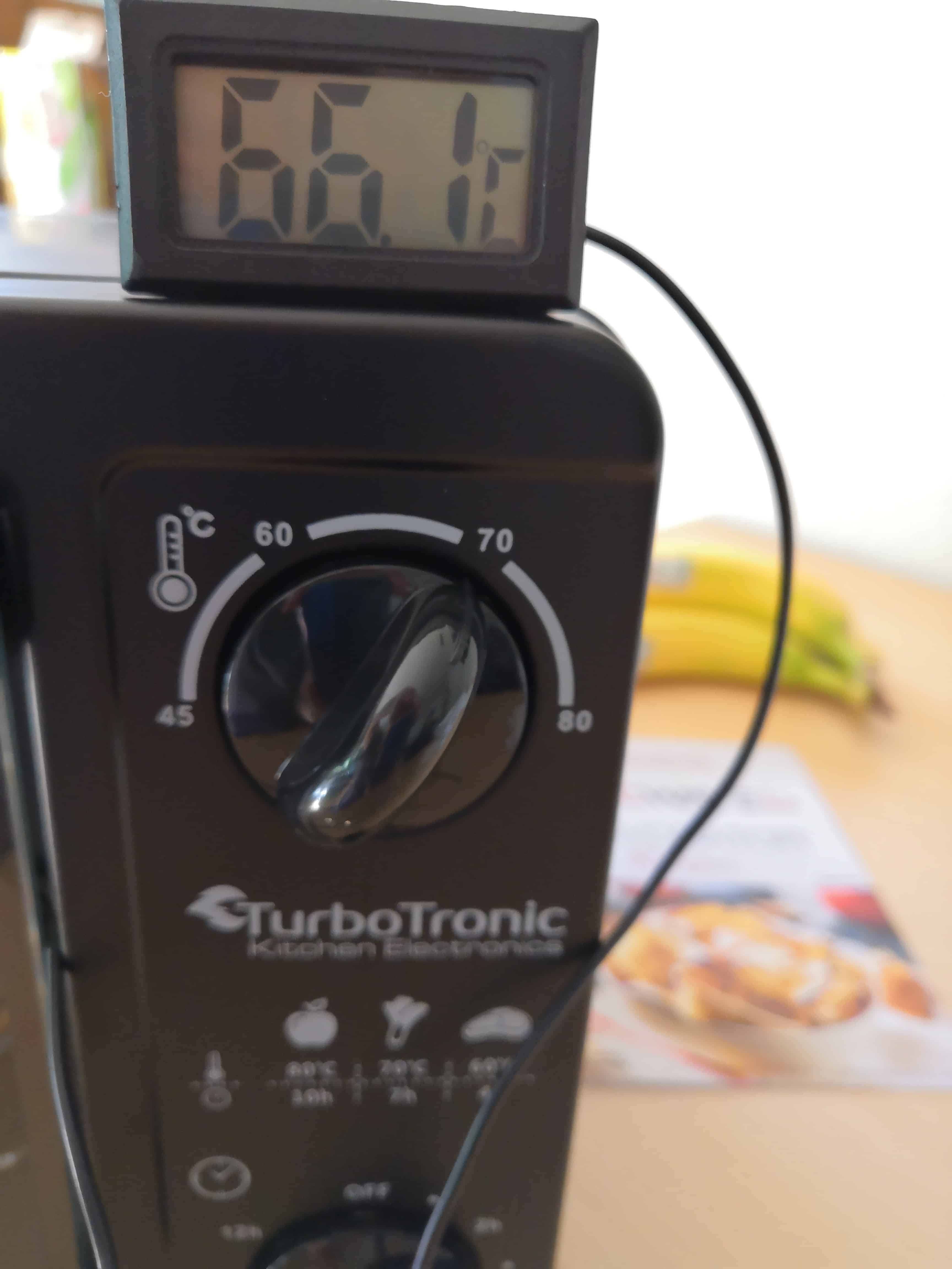 Es gibt Dörrautomaten, die heizen von unten nach oben, dann gibt es Dörrautomaten, die heizen von hinten nach vorne – und dann gibt es den TurboWave BIO. Er heizt von rechts nach links. Was das wohl für die Temperaturverteilung bedeutet? Wir messen nach ein paar Stunden die Temperatur im Gehäuseinneren. Von den eingestellten 70 Grad erreicht er Rechts auf der mittleren Etage passable 66 Grad. In der Mitte ebenfalls in Ordnung gehende 62,5 Grad. Nur links sind es lediglich 52 Grad – kein guter Wert, der bedeutet, dass für ein gleichmäßiges Dörren Etagen getauscht werden müssen. Misst man nicht auf der mittleren, sondern auf der Unteren Etage, sind die Werte allesamt um etwa 5 Grad niedriger. Eine Diskrepanz von teilweise mehr als 20 Grad ist nicht wenig. Auch wenn wir auf 80 Grad hochdrehen, wird es nur bedingt besser. Trotzdem empfehlen wir allen Nutzern, bei Rezepten für 70 Grad 80 Grad einzustellen.